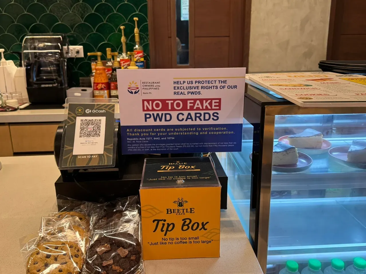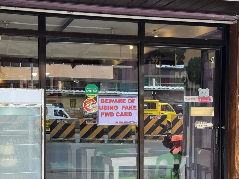 다만 이러한 여러 혜택들은 사회적 약자에게는 너무나도 좋은 제도이지만, 제도의 장점을 악용하는 사례도 많이 발생하고 있는 것으로 보입니다. 왜냐하면 식당이나 카페에서 "NO FAKE PWD CARD"라는 문구의 안내문을 어렵지 않게 찾아볼 수 있거든요. 말 그대로 장애인등록카드나 경로우대 카드를 위조하거나 복제하여 사용하는 사례들이 많다는 뜻이겠죠? 필리핀은 아직 개인정보 시스템의 전자화가 완전히 이루어지지 않다 보니, 카드 사용 내역을 로그북 공책에 수기로 기록하는 경우도 종종 보곤 합니다.