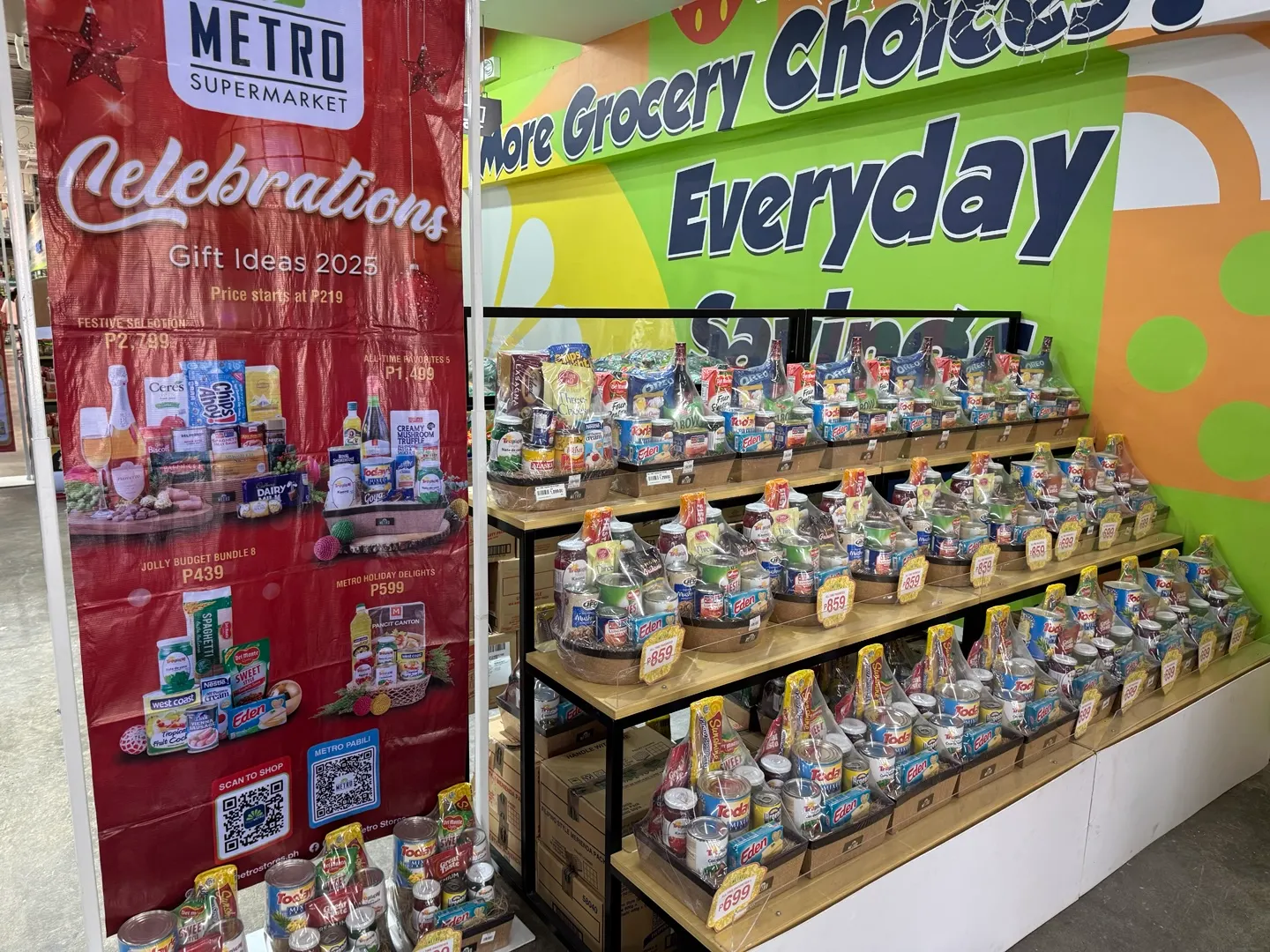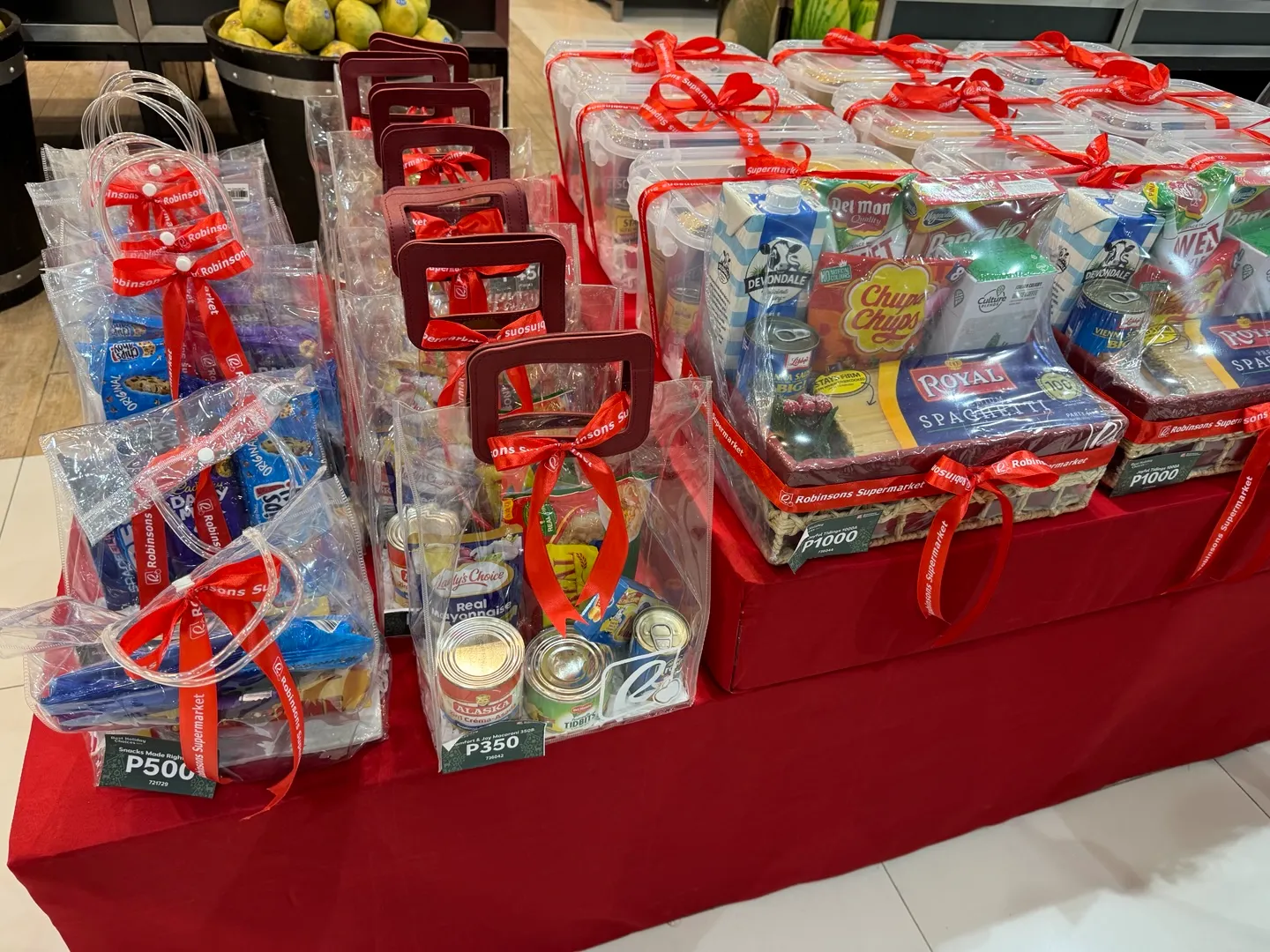 (생필품, 음식 등 다양한 물품이 섞여있는 꾸러미를 만들어 진열해 놓아요. 한국의 추석 선물세트 느낌이죠?)