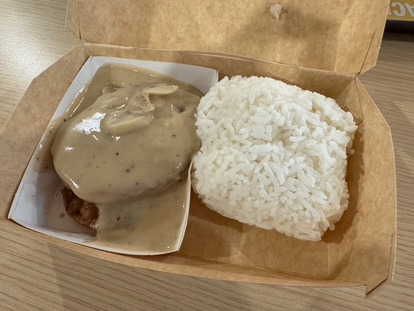: 햄버거 패티에 버섯, 후추가 들어간 양념 소스를 밥에 비벼먹습니다. (개인적으로 제가 제일 좋아하는 메뉴입니다.)
