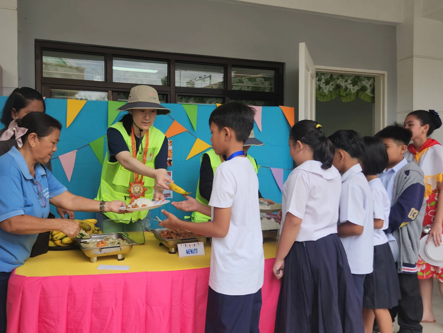 (준비된 음식과 점심을 받는 학생들의 모습)